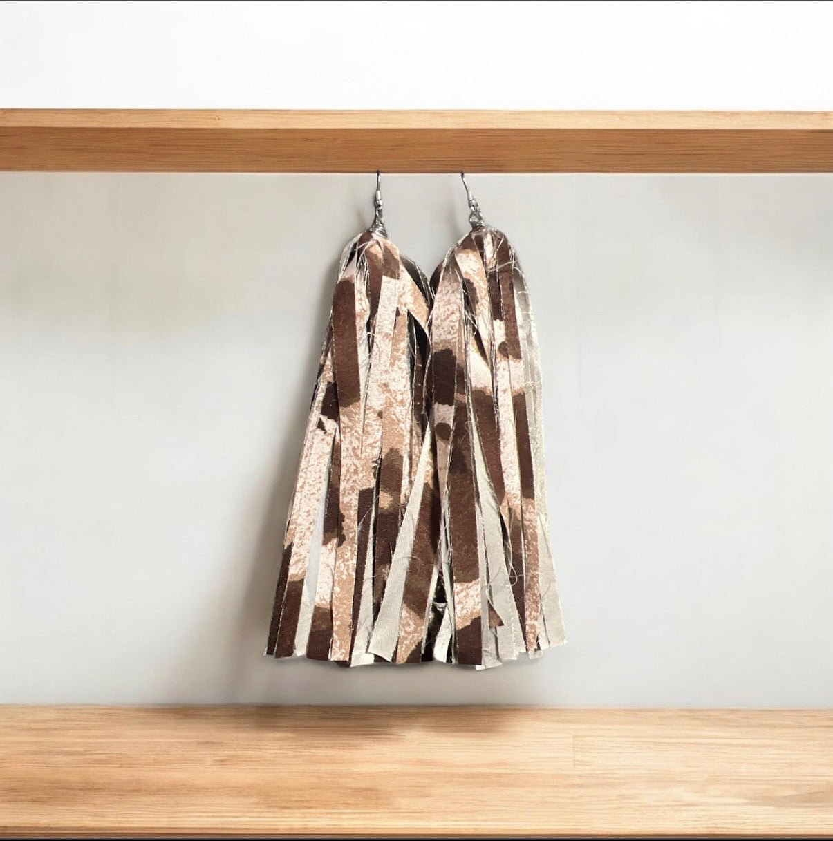 Upgrade your accessories game with our Cow Print Fabric Tassel Earrings. Hand cut with a unique distressed look, these brown and cream earrings will add a touch of unique charm to any outfit. Make a statement and turn heads with these one-of-a-kind tassel earrings.